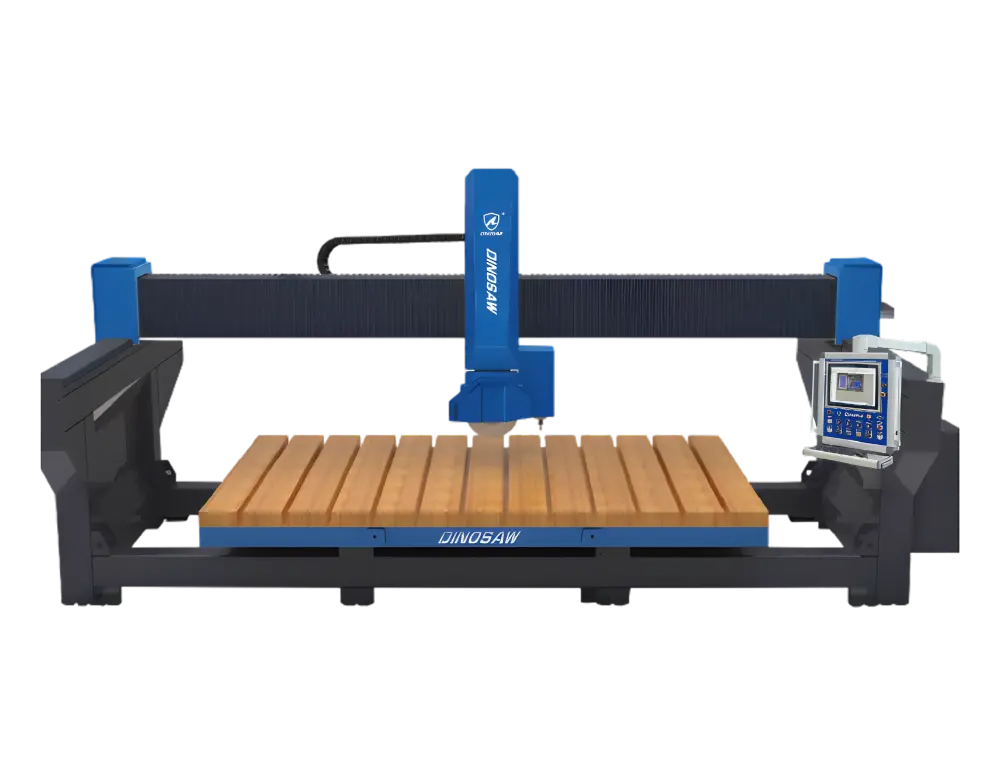 The DINOSAW 4+1 Axis CNC Bridge Saw transforms quartz countertop production through its advanced cutting capabilities and automation features. The machine's precision CNC control ensures exact dimensional accuracy with tolerances as tight as ±0.1mm, critical for creating perfectly fitting countertops with clean seams and precise edge details. The 4+1 axis configuration enables complex edge profiles to be machined directly into the countertop, eliminating separate processing steps and reducing production time.