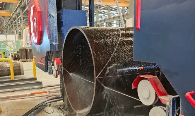 CNC wire saw cutting case for large-diameter FRP pipes, showing controlled curved and angled cuts for industrial piping and custom composite fabrication.
